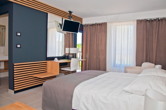 SOBA 1/2(+1) Z ALI BREZ BALKONA: Dvoposteljna soba s tuš / WC, z ali brez balkona, površina 24-28 m2, možnost dodatnega ležišča (max kapaciteta 3 osebe), klimatizirana, mini bar, sef, sušilec za lase, priključek za Internet (vključen v ceno namestitve).