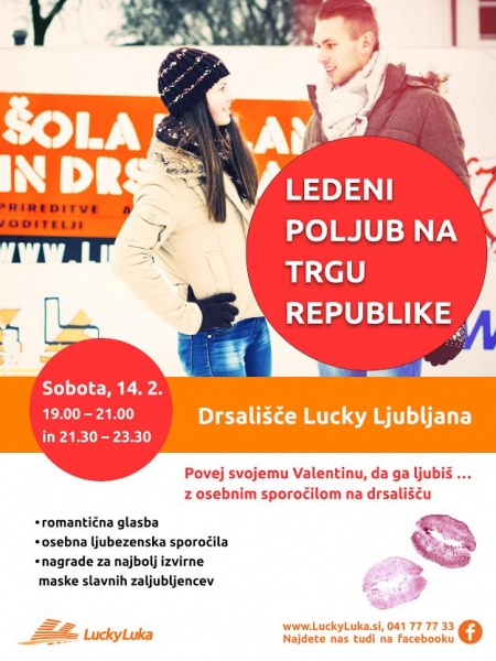 Preseneti svojega Valentina in mu povej, da ga ljubiš … Z osebnim sporočilom na drsališču. Ponudba Ledeni poljub vključuje izposojo drsalk, drsanje ob spremljavi romantične glasbe, kuhano vino ali čaj in zabavne animacije. Zaljubljenci lahko svojemu izbrancu pošljete sporočilo, ki se bo predvajalo na velikem zaslonu ob drsališču. Privoščite si drugačen zmenek! Med vsemi zaljubljenci, ki boste prišli oblečeni kot slavni pari, bodo izbrali najbolj izviren par, ki bi nagrajen z dvema vstopnicama za drsanje na drsališču Lucky Ljubljana, ki jih lahko koristita do 1. 3. 2015.