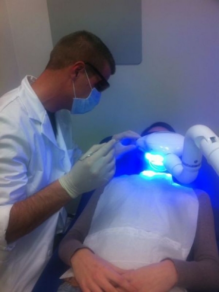 Beljenje zob je proces beljenja, ki posvetli zobno sklenino tam, kjer je umazana oz. temnejše barve. Do beljenja zob pride zaradi posebnega gela. Večina madežev bo tako izginila z nežnim delovanjem aktivne vsebine, ki ob hkratnem delovanju UV svetlobe in toplote zobe oksidira v ponovno svetlo, belo barvo. Za učinkovito beljenje zob je potrebno ustnik nositi v kratkem obdobju dvajsetih minut, ob osvetlitvi s posebo lučjo , dokler niste v celoti zadovoljni z belino svojih zob. Sistem omogoča postopno doziranje in s tem omogoča postopne rezultate, s katerimi boste zadovoljni in se sami odločili, kdaj so zobje ravno prav beli. Vaši zobje se bodo pobelili za približno 7-12 odtenkov v eni uri. Tovrstno beljenje zob v nobenem primeru ne škoduje negativno na zdravo in normalno sklenino.